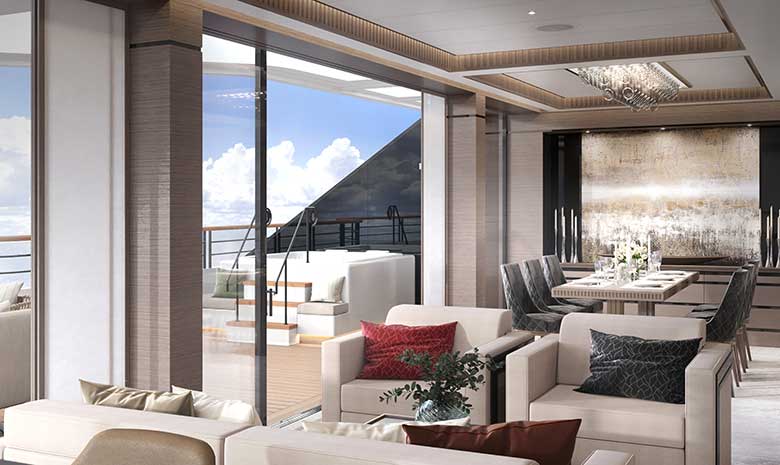- Dramatic floor to ceiling glass throughout. Private terrace overlooking the ocean. Luxurious and modern living and dining area. Luxury queen bed sleep system. Double vanity bathrooms. Dedicated Personal Assistant is your single onboard touch point to ensure a flawless, seamless journey from beginning to end. 24-hour in-suite dining, state of the art espresso machine, complimentary coffee and teas, and a fully stocked refrigerator.