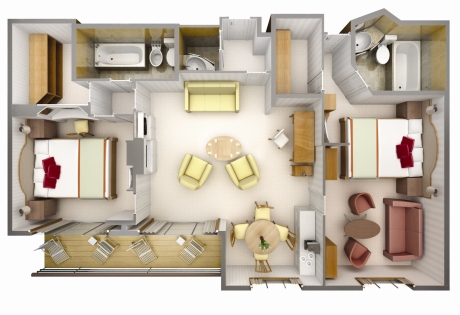 - Expertly designed and exquisitely appointed. Ideal for entertaining friends or enjoying a quiet dinner “at home”. Whatever you wish. Two teak verandas with patio furniture and floor-to-ceiling glass doors; two-bedroom has additional veranda Living room with seating area; two-bedroom has additional sitting area Separate dining area Queen-sized bed; two-bedroom has additional queen-sized bed Marbled bathroom with full-sized whirlpool tub; two-bedroom has additional marbled bathroom with full-sized bath Walk-in wardrobe(s) and personal safe Vanity table(s) with hair dryer Writing desk(s) Flat screen television(s) with DVD and satellite reception DVD/CD player Direct-dial telephone(s)